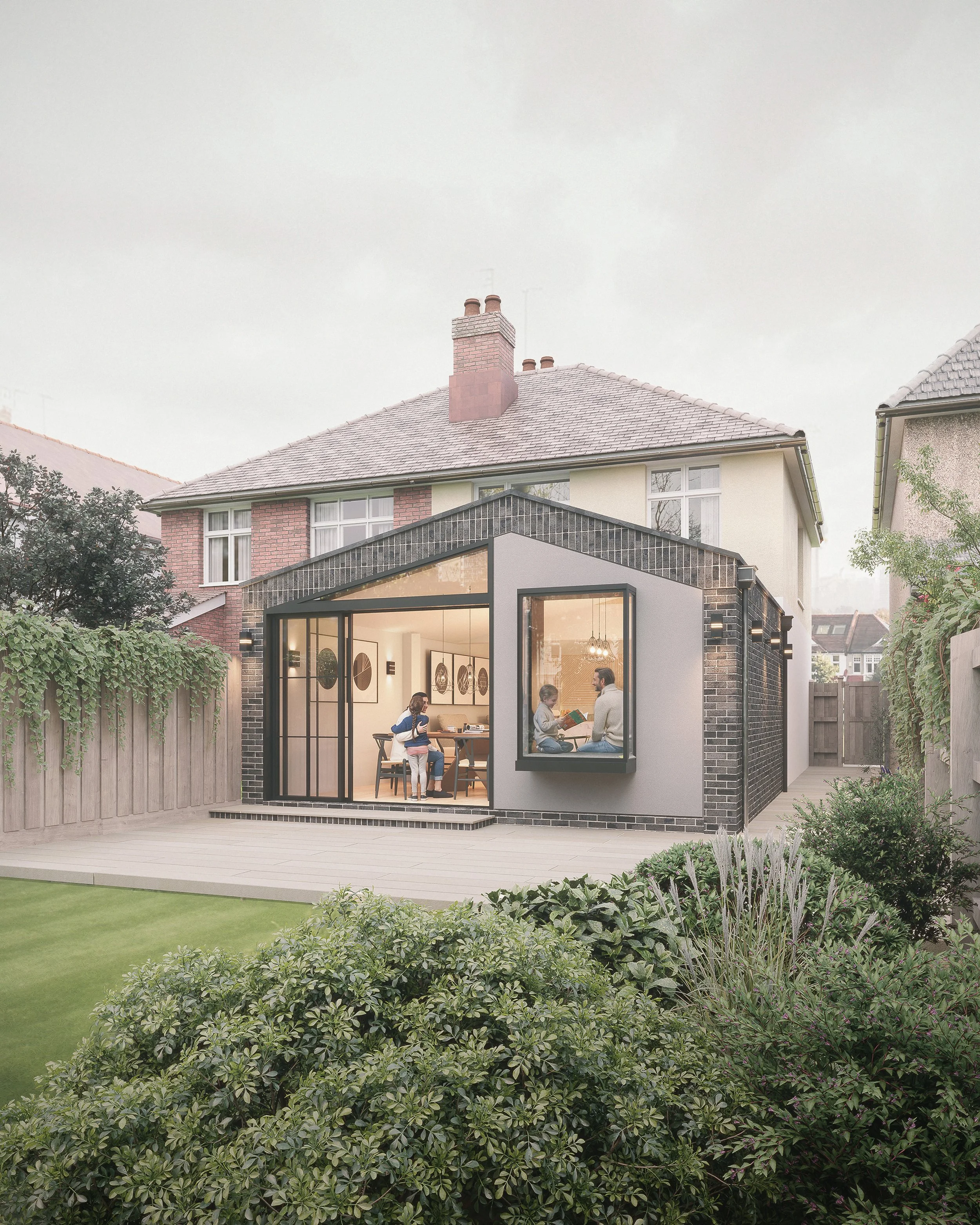 The use of black brick ensures that the extension draws on materials evident in the local area, whilst providing a contemporary twist. The localised application of grey toned render on the rear facing elevation picks on materials used on the application dwelling, and pairs with the geometry of the doors and feature window to create a masonry framework on the end elevation.