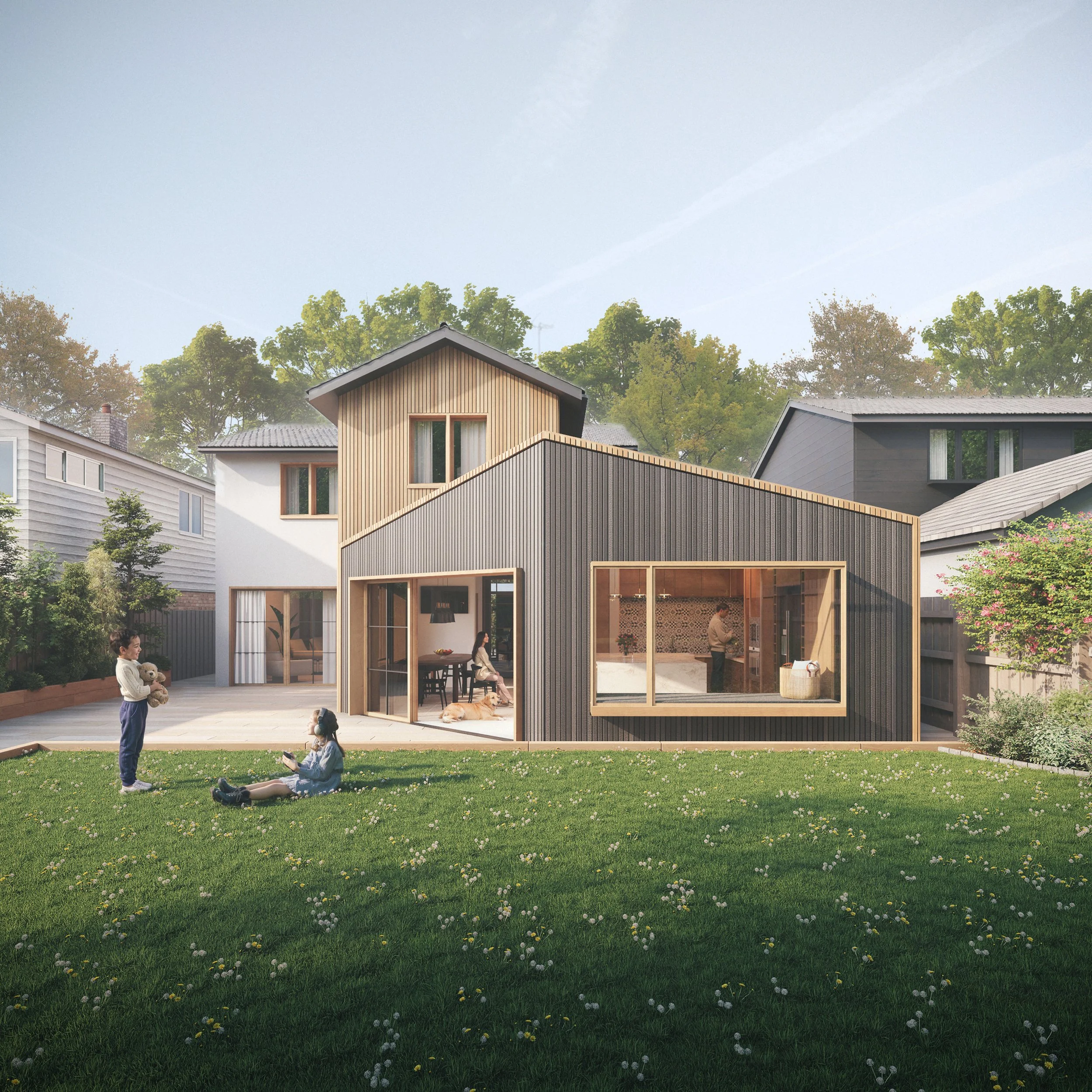 A dynamic roofscape further articulates the design, stepping away from a single homogenous mass and instead expressing the extension as a collection of interrelated forms. This varied roof profile reduces the perceived scale of the development while introducing visual interest and contemporary character.