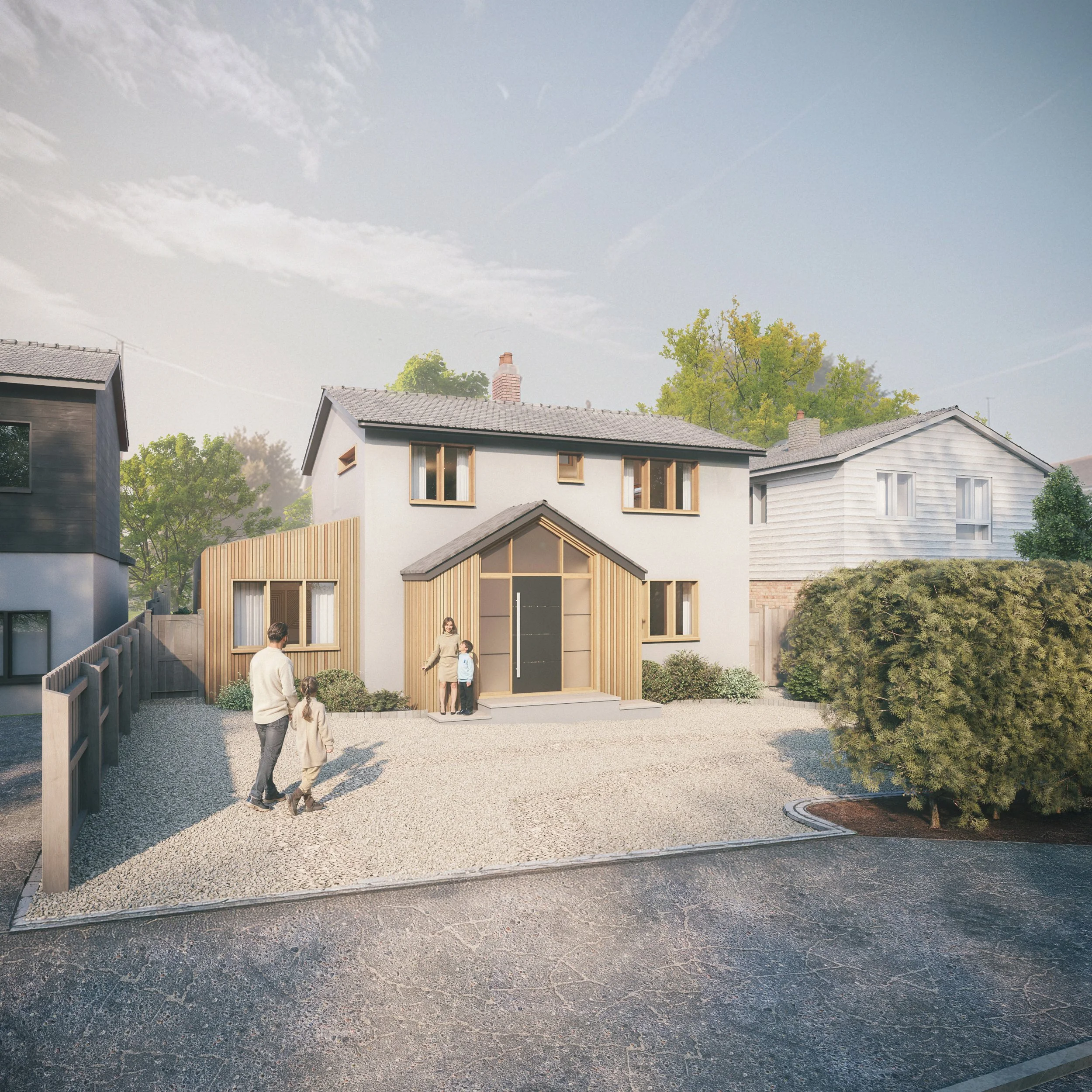 Design: The proposal seeks to refurbish and extend the existing dwelling in a way that is contemporary yet sympathetic to its residential context. The design retains the original, central form of the house, replacing the existing timber cladding and facing brickwork with light tones external render, providing a clean and enduring backdrop that enhances the legibility of the extension.